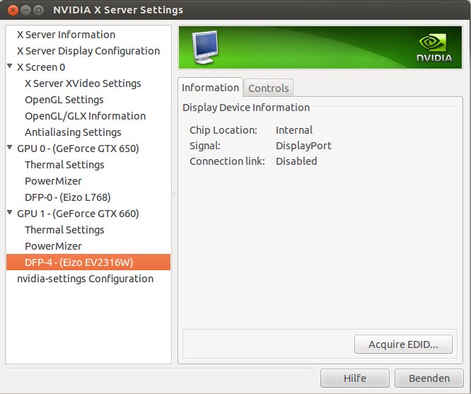 I have one Geforce GTX 650 and one Geforce GTX 660. Each is connected with one monitor. The screen at the GTX 650 is working. I’m using Ubuntu 12.04 with the kernel 3.8.0.35.