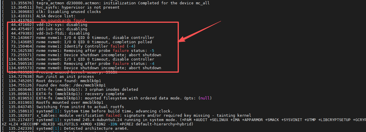 自研的主板上在PCIe C4上使用桥片连接了两个NVME,现在开机进系统有错误信息,现在系统下能识别到控制器但是找不到设备,麻烦帮忙看下是哪里的问题?要如何处理?