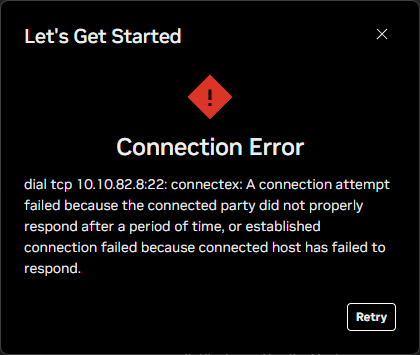 after numerous reboots, I’ve been able to connect via a local monitor and keyboard…can also ssh to DGX Spark from my Mac. Nvidia Sync will not connect. I uninstalled, re-installed and tried to add back DGX in settings but get the above error. SSH works however.