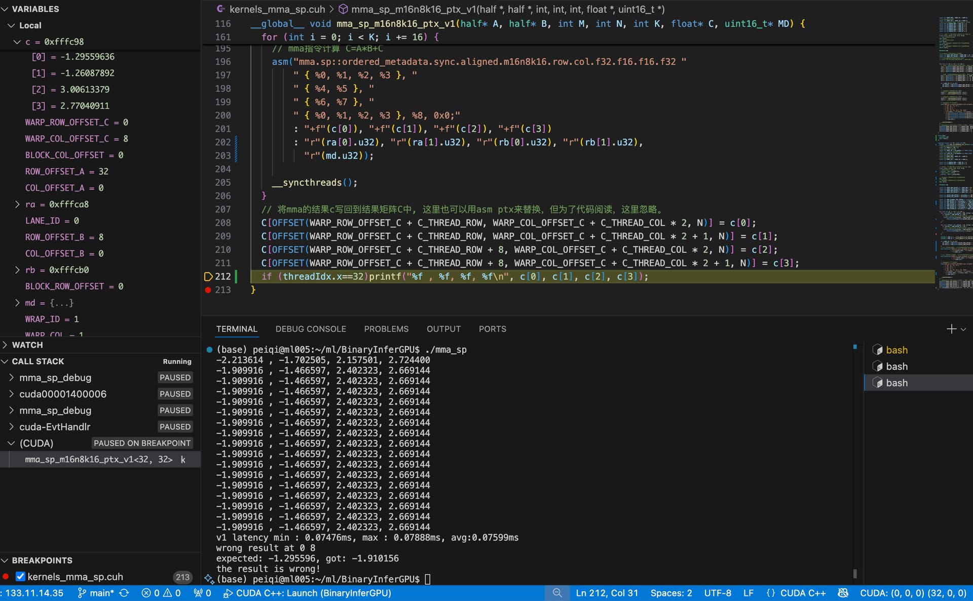 The strange thing is that the results shown in CUDA-GDB is correct, but the results from printf is wrong. The program finally write back wrong results.