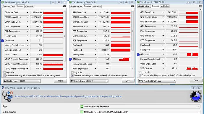 I fired up 3 instances of GPU-z, for a better graphical representation of what my 3 GPU’s processing activity was, while each test was running.