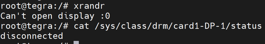 I need to determine whether the monitor is connected through software. After plugging in the monitor, the Ubuntu desktop can be displayed, but xrandr shows “Can’t open display :0”. Additionally, cat /sys/class/drm/card1-DP-1/status returns “disconnected”. when the monitor is plugged in, there is no output in dmesg .