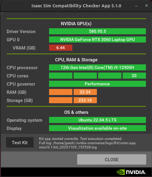 Starting kit application with the following args: [‘/home/jpech/isaacsim/exts/isaacsim.simulation_app/isaacsim/simulation_app/simulation_app.py’, ‘/home/jpech/isaacsim/apps/isaacsim.exp.base.python.kit’, ‘–/app/tokens/exe-path=/home/jpech/isaacsim/kit’, ‘–/persistent/app/viewport/displayOptions=3094’, ‘–/rtx/materialDb/syncLoads=True’, ‘–/rtx/hydra/materialSyncLoads=True’, ‘–/omni.kit.plugin/syncUsdLoads=True’, ‘–/app/renderer/resolution/width=1280’, ‘–/app/renderer/resolution/height=720’, ‘–/app/window/width=1440’, ‘–/app/window/height=900’, ‘–/renderer/multiGpu/enabled=True’, ‘–/app/fastShutdown=True’, ‘–/app/installSignalHandlers=0’, ‘–ext-folder’, ‘/home/jpech/isaacsim/exts’, ‘–ext-folder’, ‘/home/jpech/isaacsim/apps’, ‘–/physics/cudaDevice=0’, ‘–/plugins/carb.tasking.plugin/threadCount=20’, ‘–/plugins/omni.tbb.globalcontrol/maxThreadCount=20’, ‘–portable’]