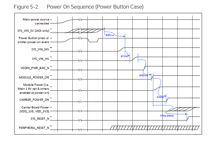Hey Chris, so we were able to get something close to working on the module. Currently, our VDDIN_PWR_BAD is getting pulled low and is causing our CARRIER_POWER_ON to go low and stay low. This happens when we drive PERIPHERAL_RESET_N high. We keep PERIPHERAL_RESET_N low during the power sequence till the very end. We have been trying to take parts off to make sure we don’t have any type of back feeding or inrush, but that isn’t getting us anywhere. Our 5V, 3V3, and 12V rails are steady and stable.