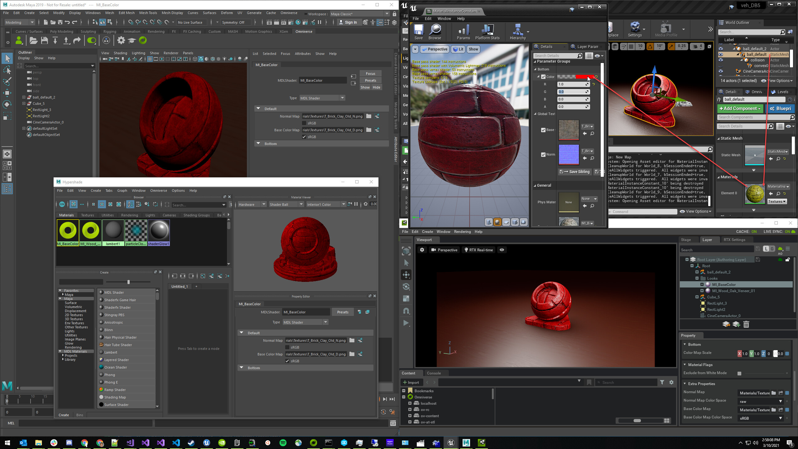 I’ve exported it to Omniverse as a USD stage + MDL materials and opened it with live-sync enabled in Maya, UE4, and Create. I then went to UE4’s material instance editor and made the material’s Color Map Scale red:
