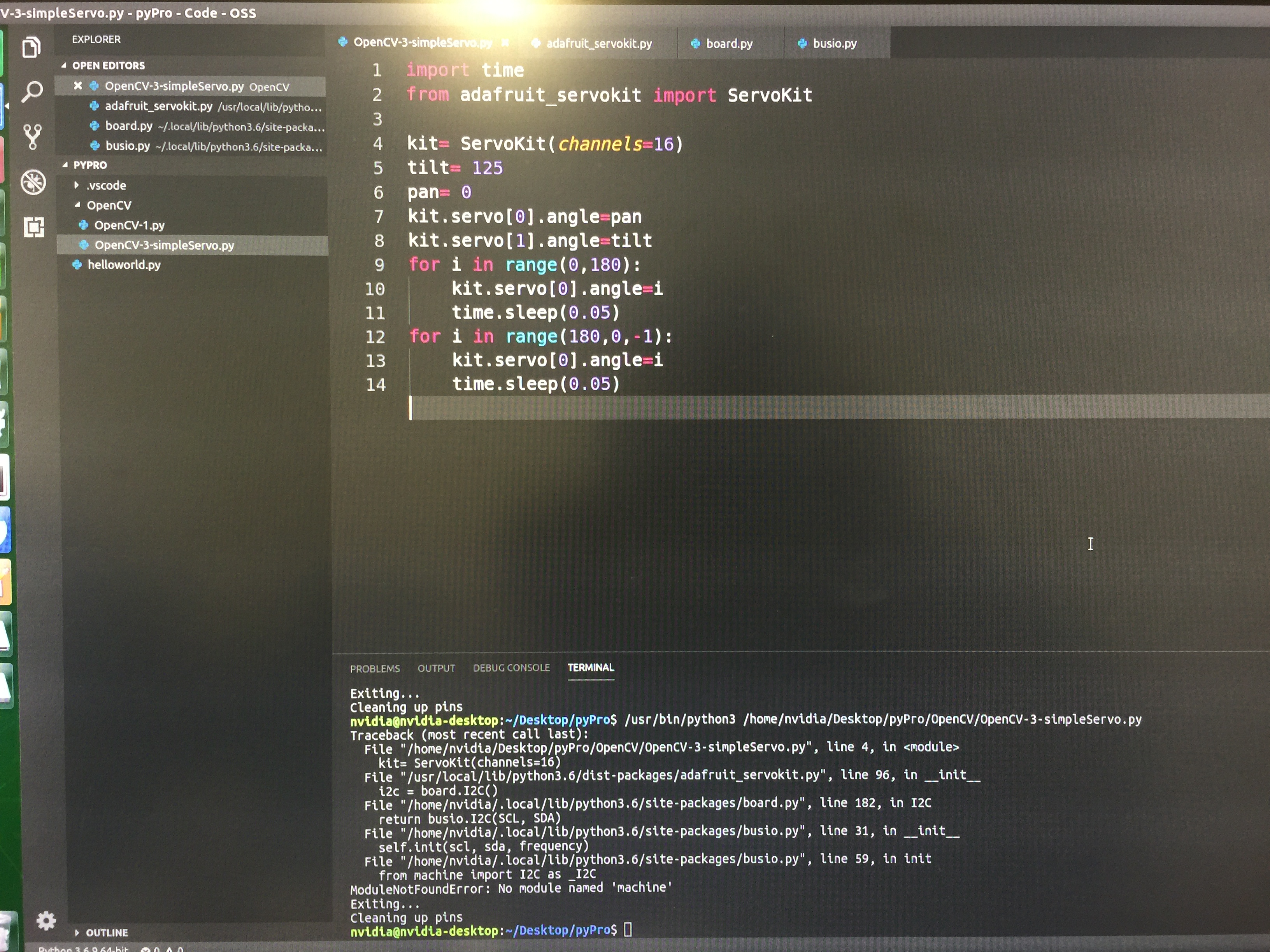 adafruit_servokit ServoKit appears to have no errors. I think it is my Xavier NX I2C bus malfunctioning, but I am unable to determine why. I also tried rebooting the Xavier NX and it did not resolve this issue. Is there something I can do to reset the bus?